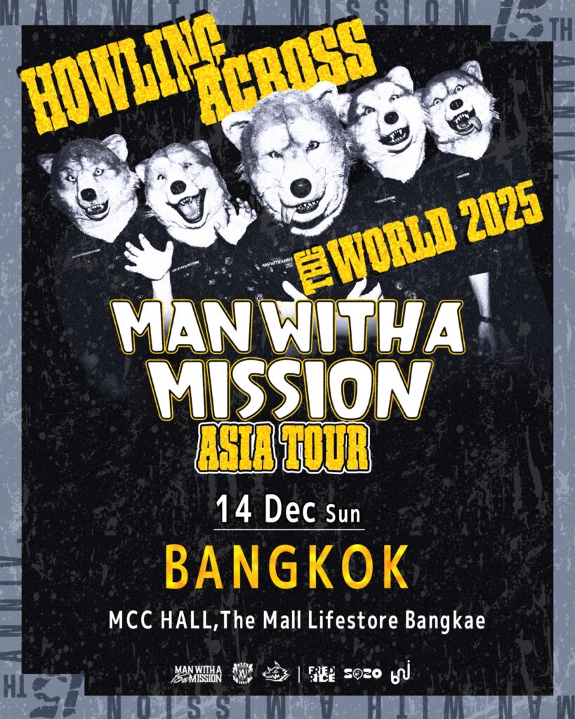 เตรียมต้อนรับพลังเสียงสุดเร้าใจ วงร็อกชื่อดังจากญี่ปุ่นMAN WITH A MISSIONที่พร้อมมอบโชว์สุดมันส์ เสียงกีตาร์กระหน่ำ แสงไฟระเบิดพลัง และหมาป่าร็อกสุดเท่กลับมาเขย่าเวทีอีกครั้ง MAN WITH A MISSION ส่งคลิปบรรยากาศความสนุกสุดเหวี่ยงจากทัวร์ต่างประเทศมาเรียกน้ำย่อยแฟน ๆ ชาวไทย พวกเขากำลังจะมาระเบิดความมันส์แบบจัดเต็มในคอนเสิร์ต HOWLING ACROSS THE WORLD2025 – ASIA TOURที่กรุงเทพฯในวันอาทิตย์ที่ 14 ธันวาคม 2568 เวลา 17:00 น.ณMCC HALLชั้น3เดอะมอลล์ไลฟ์สโตร์ บางแคโดยมีFriedRice Entertainment, SOZO และBNJ Entertainmentร่วมจัดงาน ซึ่งครั้งนี้ถือเป็นโชว์ปิดท้ายการทัวร์เอเชียของพวกเขา