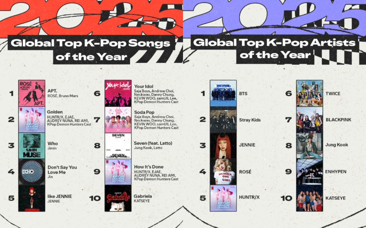 สำหรับ Global Top K-Pop Songs of 2025 แสดงให้เห็นถึงความหลากหลายของเพลงและโมเมนต์ที่โดนใจผู้ฟังทั่วโลก โดยอันดับหนึ่งได้แก่ เพลง “APT.” ของ ROSÉ และ Bruno Mars ตามด้วย “Golden” ของ HUNTR/X, EJAE, AUDREY NUNA, REI AMI และ KPop Demon Hunters Cast (#2) อันดับถัดมาคือ “Who” ของ Jimin (#3), “Don’t Say You Love Me” ของ Jin (#4) และ “like JENNIE” ของ JENNIE (#5)